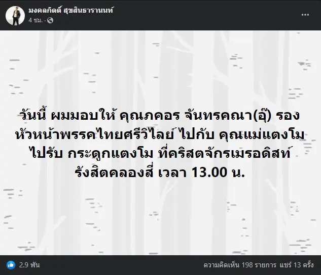วันนี้ ผมมอบให้ คุณภคอร จันทรคณา(อุ๊) รองหัวหน้าพรรคไทยศรีวิไลย์ ไปกับ คุณแม่แตงโม ไปรับ กระดูกแตงโม ที่คริสตจักรเมรอดิสท์ รังสิตคลองสี่ เวลา 13.00 น.