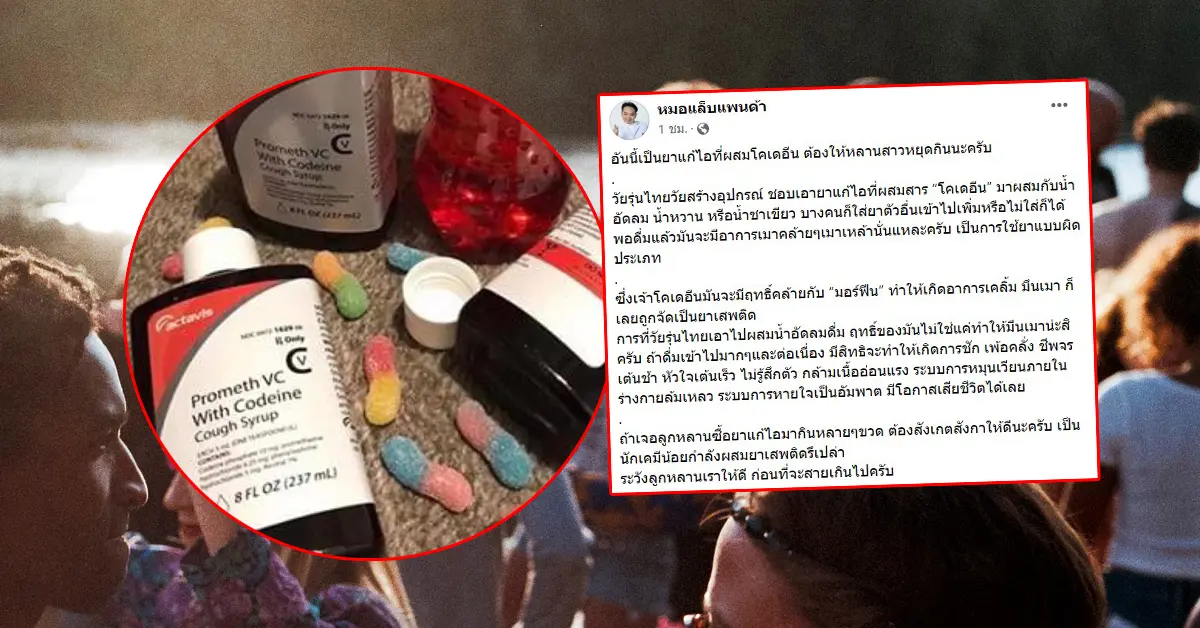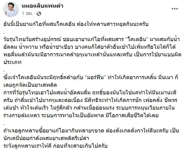 โดยหมอแล็บก็ได้ให้ความรู้ว่า ยาดังกล่าวคือ “ยาแก้ไอที่ผสมโคเดอีน ต้องให้หลานสาวหยุดกินนะครับ วัยรุ่นไทยวัยสร้างอุปกรณ์ ชอบเอายาแก้ไอที่ผสมสาร “โคเดอีน” มาผสมกับน้ำอัดลม น้ำหวาน หรือน้ำชาเขียว บางคนก็ใส่ยาตัวอื่นเข้าไปเพิ่มหรือไม่ใส่ก็ได้ พอดื่มแล้วมันจะมีอาการเมาคล้ายๆเมาเหล้านั่นแหละครับ เป็นการใช้ยาแบบผิดประเภท