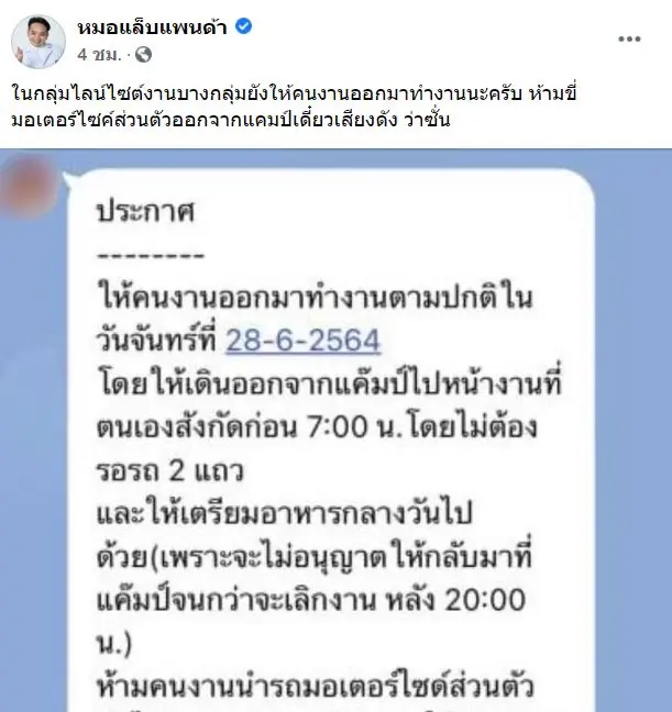 เพจ หมอแล็บแพนด้า โพสต์ข้อความแฉยับ แคมป์ก่อสร้างแหกคำสั่ง ผบ.ทบ. ให้คนงานทำงานตามปกติ 28 มิ.ย.นี้