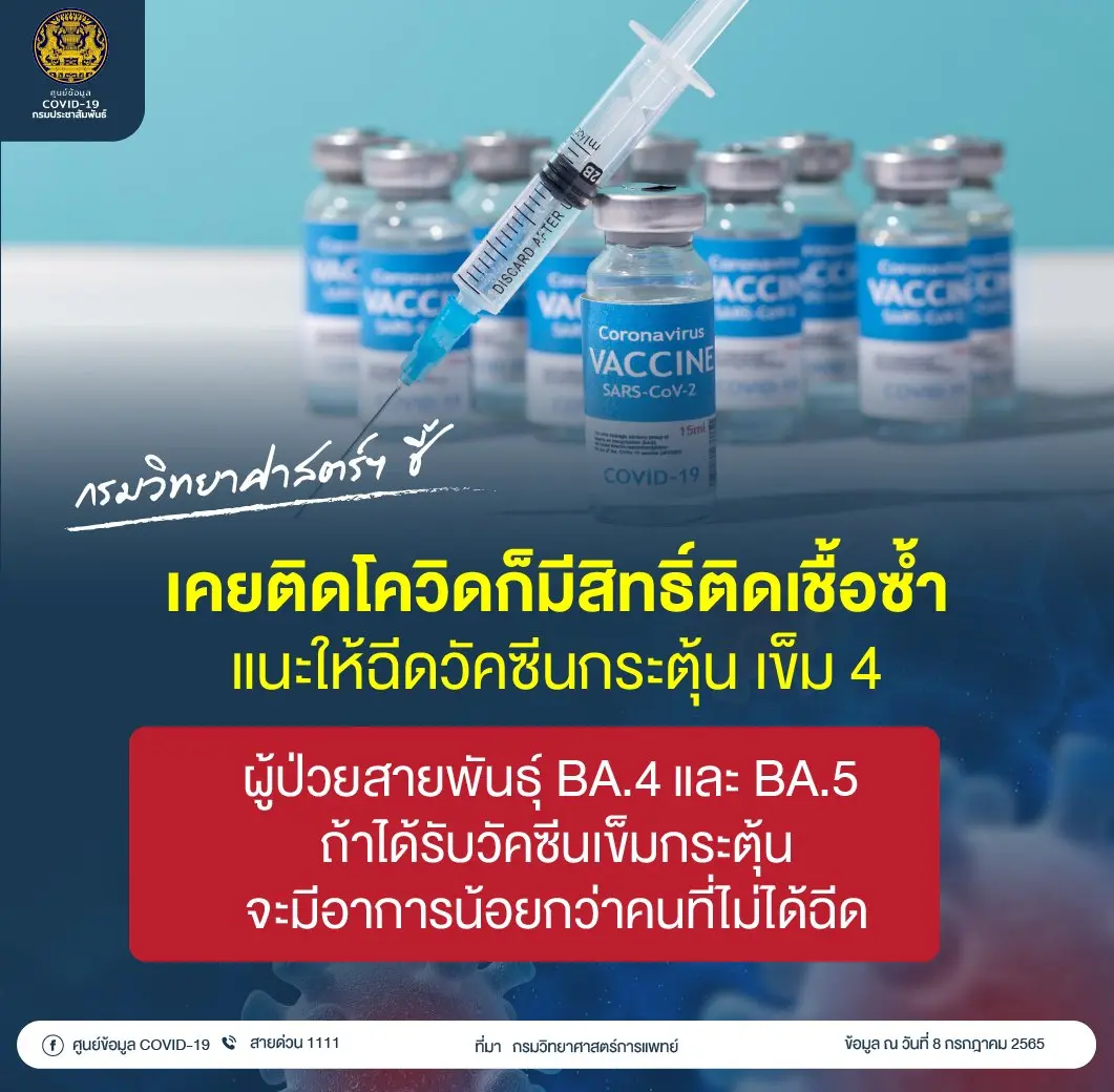 โดยเฉพาะในคนที่ไม่ได้รับวัคซีน หรือรับวัคซีนไม่ครบ 3 เข็ม จะเป็นกลุ่มที่ติดเชื้อได้ง่ายหรือมีโอกาสเป็นโควิดซ้ำได้มากกว่ากลุ่มที่ได้วัคซีนครบ กรมวิทยาศาสตร์การแพทย์ จึงแนะนำให้ฉีดวัคซีนกระตุ้นเพิ่มเป็นเข็มที่ 4 เพราะมีข้อมูลในต่างประเทศ พบว่า ผู้ป่วยสายพันธุ์ BA.4 และ BA.5 ถ้าได้รับวัคซีนเข็มกระตุ้นจะมีอาการน้อยกว่าคนที่ไม่ได้ฉีด เท่ากับว่าวัคซีนยังได้ผลในการป้องกันอาการหนักและเสียชีวิต