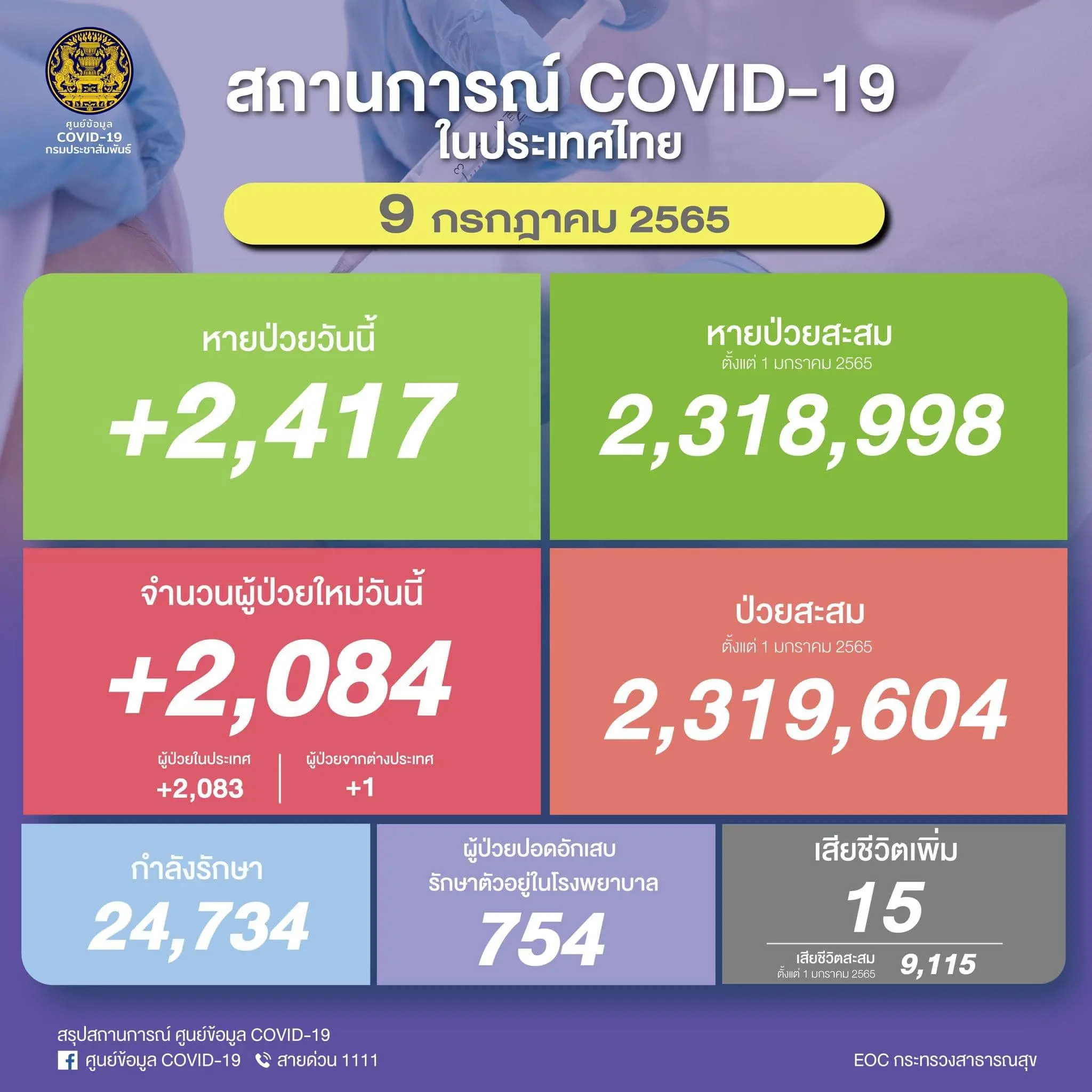 โดยข้อมูลจากเพจเฟซบุ๊ก ศูนย์ข้อมูล COVID-19 และเว็บไซต์ www.ddc.moph.go.th วันนี้พบผู้ติดเชื้อรายใหม่ 2,084 ราย หากนับรวมยอดผู้ติดเชื้อตั้งแต่ช่วงวันที่ 1 มกราคม 2565 จำนวนผู้ป่วยสะสม 2,319,604 ราย ในส่วนของผู้เสียชีวิตวันนี้ 15 ราย หากนับรวมยอดผู้เสียชีวิตตั้งแต่ช่วงวันที่ 1 มกราคม 2565 ที่ผ่านมานั้น เป็นจำนวน 9,115 ราย