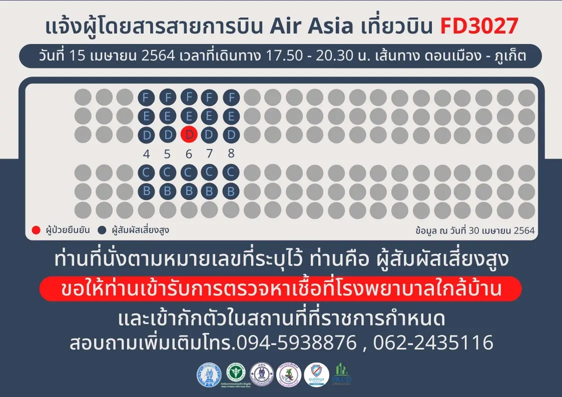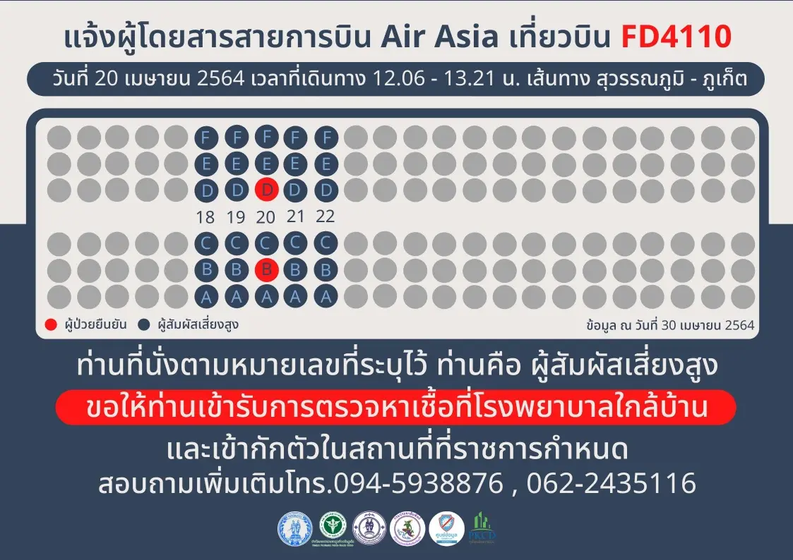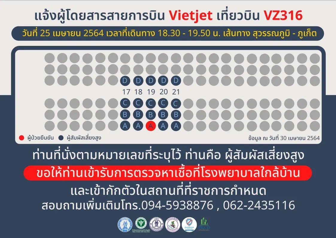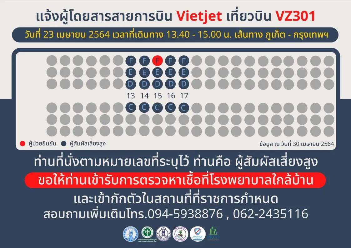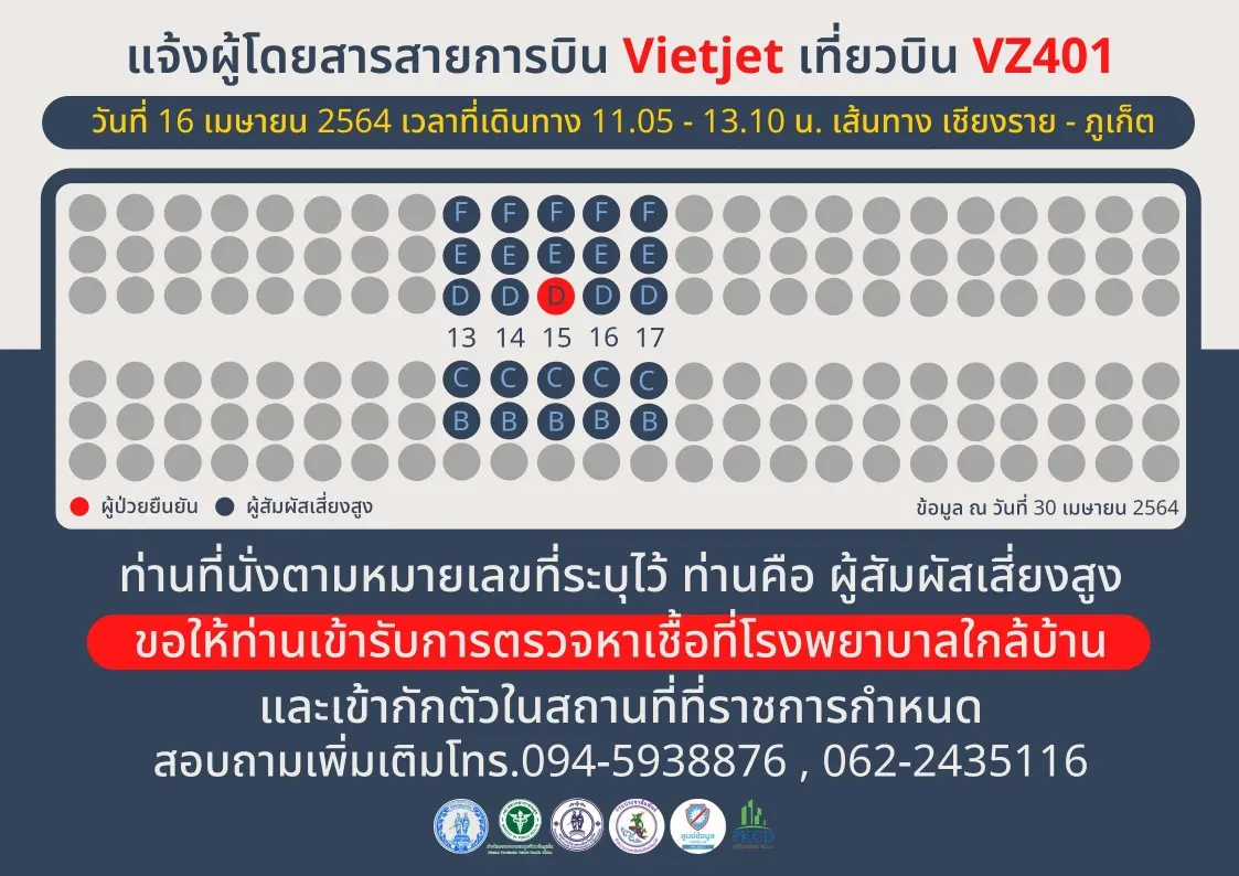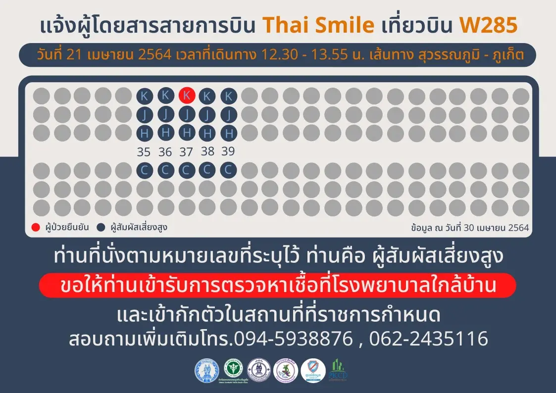 ประกาศจาก เพจเฟซบุ๊ก ศูนย์ข้อมูลโควิดจังหวัดภูเก็ต ตามหากลุ่มเสี่ยงที่ใกล้ชิดกับผู้ติดเชื้อยืนยันจากการเดินทางด้วยเครื่องบิย จาก 3 สายการบิน เส้นทางสุวรรณภูมิ ดอนเมือง เชียงราย ถึง ภูเก็ต โดยมีทั้งหมด 7 เที่ยวบิน จากสายการบิน Air Asia Vietjet และ Thai Smile