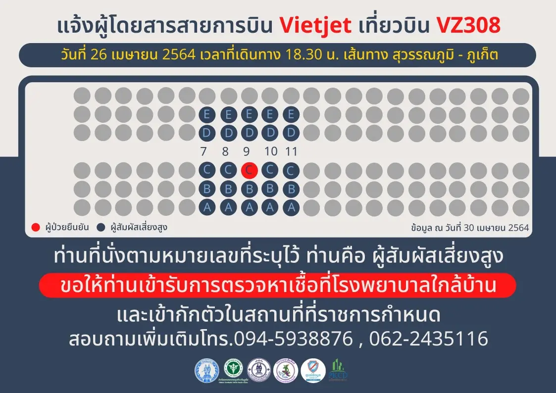 หากท่านคือบุคคลที่เดินทางเส้นทาง สุวรรณภูมิ- ภูเก็ต จากสายการบิน Air Asia Vietjet และ Thai Smile และเป็นหนึ่งในเที่ยวบินทั้ง 7 นี้ ท่านคือบุคคลที่มีความเสี่ยงต่อการติดเชื้อสูง ทางการขอความร่วมมือตรวจหาเชื้อโควิด-19 ที่โรงพยาบาลใกล้ตัวของท่าน และ กักตัวอยู่ในพื้นที่บ้าน หรือสถานที่ที่ราชการจัดไว้ให้