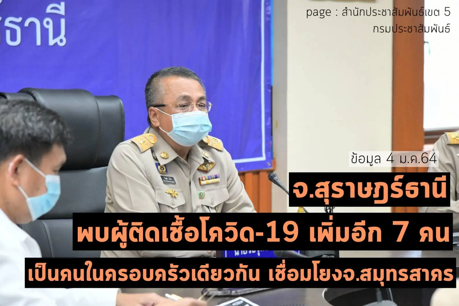 4 ม.ค. 64 นายวิชวุทย์ จินโต ผู้ว่าราชการจังหวัดสุราษฎร์ธานี แถลงข่าวพบผู้ติดเชื้อโควิด-19 รายใหม่ในพื้นที่ 7 ราย ระบุว่า ผู้ติดเชื้อรายใหม่เป็นหญิงไทย อายุ 50 ปี เป็นชาว จ.สมุทรสาคร มีอาการที่เข้าองค์ประกอบตรวจหาเชื้อพบโควิด