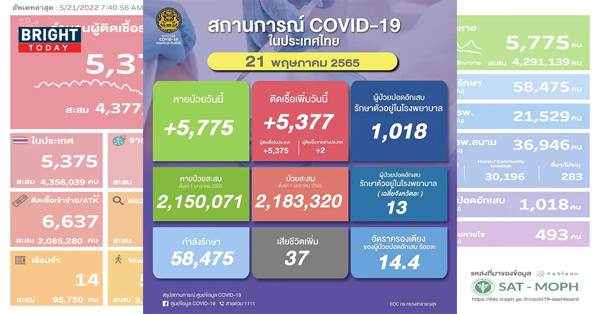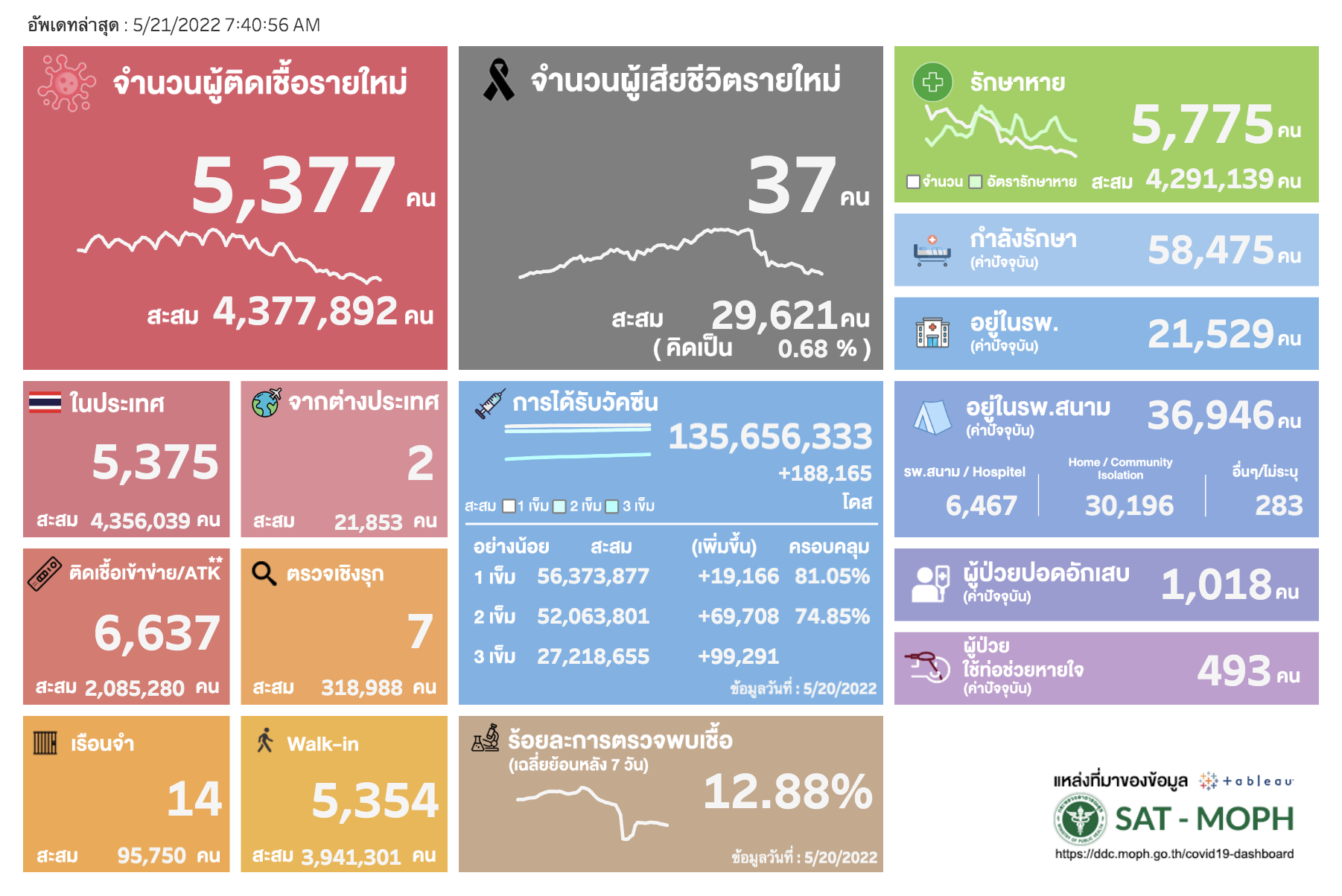 ตัวเลขผู้ติดเชื่อ ลดลงต่อเนื่อง! โควิดวันนี้ 21/5/65 ติดเชื้อรายใหม่ 5,377 ราย ไม่นับรวมATK อีกจำนวน 6,637 ราย เสียชีวิต 37 ราย