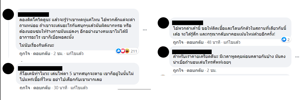 และ เฟซบุ็ต Red Skull In Love ได้ออกมาโพสต์ ถึงกลุ่มผู้ติดเชื่อโควิดอีกกลุ่มหนึ่ง ที่เปิดวงไพ่ เล่นกันกลางรพ.สนามเลย “น่าไล่กลับไปให้นอนรอการรักษาอยู่ที่บ้านนะอีห่าน รพ.สนาม เค้าให้ผู้ติดเชื้อไปพักรักษาตัว รักษาระยะห่าง แต่ยังมีคนไปรวมกลุ่มตั้งวงไพ่ในนั้นต่ออีก คนป่วยอีกหลายคนยังไม่มีเตียง แต่อีพวกนี้ มาจากเลาจน์แหล่งแพร่ระบาดหลักๆเลย กลับมองเป็นเรื่องสนุก ควย” กลายเป็นที่วิพากษ์วิจารณ์ถึงความเหมาะสมของการกระทำนี้ อีกทั้งเป็นคำถามที่ว่า เล่นไพ่แบบนี้ผิดกฏหมายหรือไม่ สามารถเอาผิดกับใครได้บ้าง