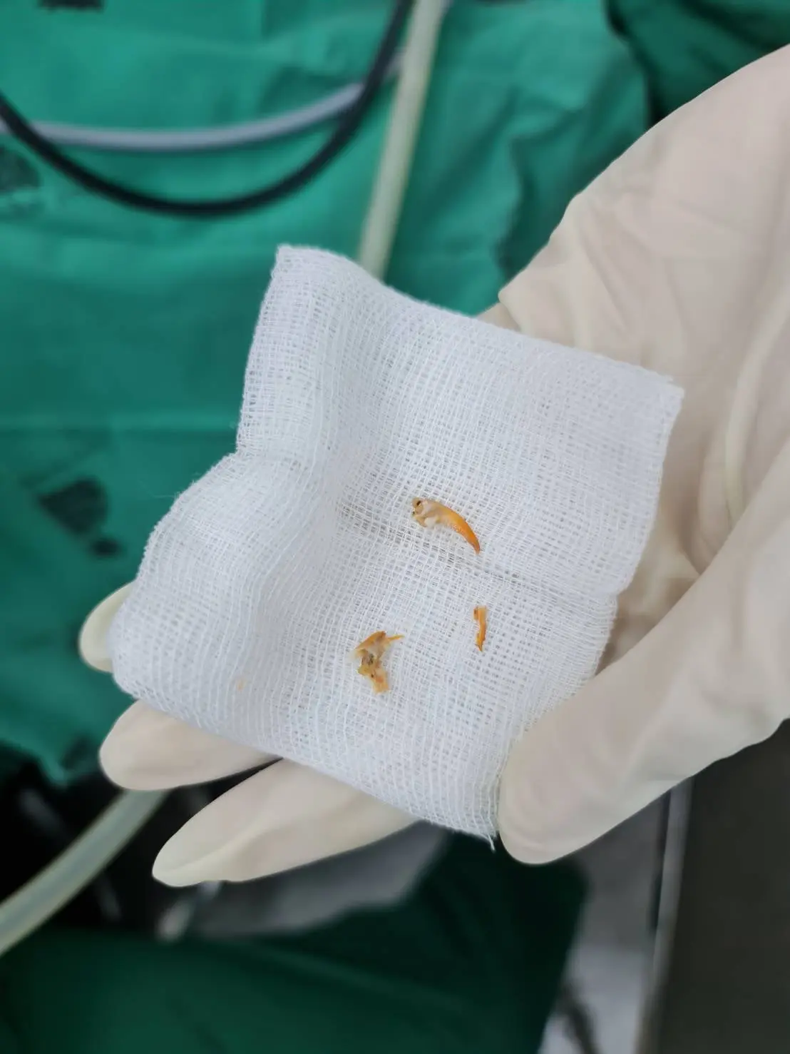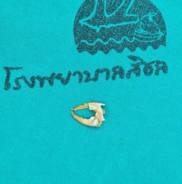 พบชิ้นส่วนสิ่งแปลกปลอม 2 ชิ้น แทงติดกับหลอดอาหารลึกพอสมควร คีบออกมาได้หมด แล้วใช้น้ำล้างทำความสะอาดตรงตำแหน่งที่เป็นแผล เมื่อเอาสิ่งแปลกปลอมที่คืบออกมามาต่อกัน ต้องตะลึงทีเดียว เพราะมันกลายเป็นก้ามปูดีๆนี่เอง จึงโอละพ่อ ขนมจีนน้ำยาปูเป็นเหตุ ใส่ก้ามปูไปด้วย อันตรายอย่างยิ่ง