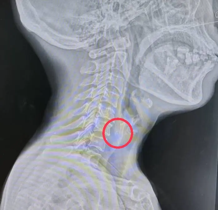 จากภาพจะเห็นเงาขาว ๆ จาง ๆ 2 ชิ้น อยู่บริเวณลำคอ ระดับเดียวกับกระดูกคอที่ 6 จึงสงสัยว่าน่าจะมีสิ่งแปลกปลอมเป็นเศษกระดูกอะไรสักอย่างที่ผู้ป่วยกินเข้าไปแล้วติดในหลอดอาหาร ส่วนบน
