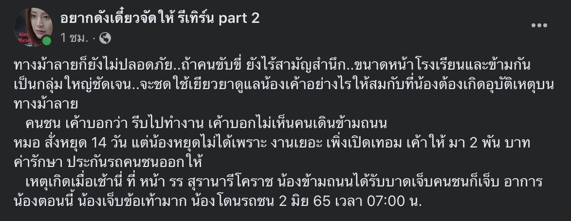 คนชน เค้าบอกว่า รีบไปทำงาน เค้าบอกไม่เห็นคนเดินข้ามถนนหมอ สั่งหยุด 14 วัน แต่น้องหยุดไม่ได้เพราะ งานเยอะ เพิ่งเปิดเทอม เค้าให้ มา 2 พัน บาทค่ารักษา ประกันรถคนชนออกให้