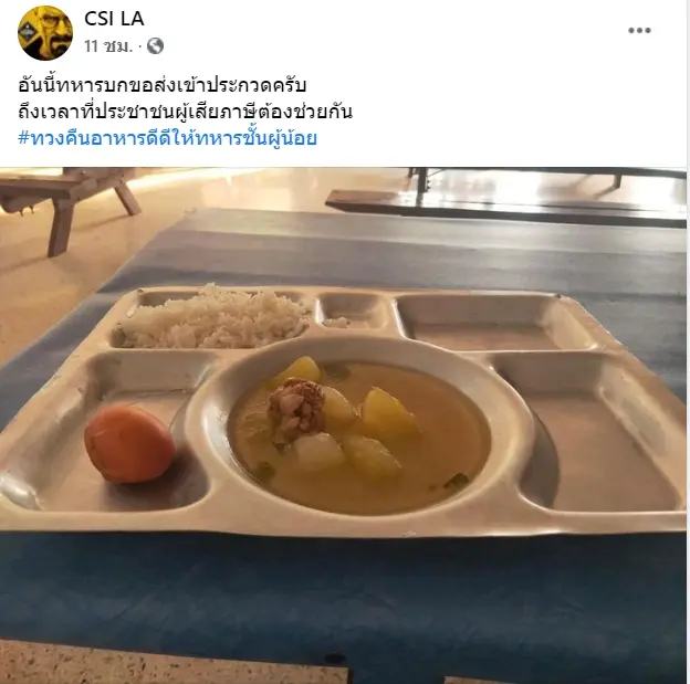 อาหารทหาร CSI LA เพจจอมแฉชื่อดังบนโลกออนไลน์ โพสต์ข้อความประกอบภาพอาหารจากทหารบก ที่ส่งภาพอาหารบนจานหลุม มีเพียงข้าว , ไข่1 ฟอง, และแกงจืด เท่านั้น