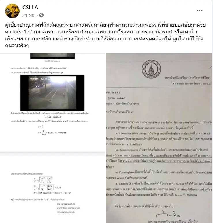 เพจดังเผย ผู้เชี่ยวชาญภาคฟิสิกส์คณะวิทยาศาสตร์มหาลัยจุฬาคำนวณว่ารถเฟอร์รารี่ที่ บอส อยู่วิทยา ขับมาด้วยความเร็ว177 ต่อชั่วโมง และทางโรงพยาบาลยังชี้ว่า พบสารโคเคนในเลือดของบอสอีกด้วย