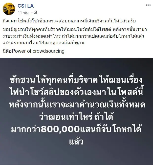 ขอเชิญชวนให้ทุกคนที่บริจาคให้ฌอนโชว์สลิปใต้โพสต์ หลังจากนั้นเรามารวบรวมว่าเงินทั้งหมดเท่าไหร่ ถ้าได้มากกว่าแปดแสนก้อจับโกหกได้แล้ว จะขุดรากถอนโคน18มงกุฏต้องมีหลักฐาน นี่คือPower of crowdsourcing