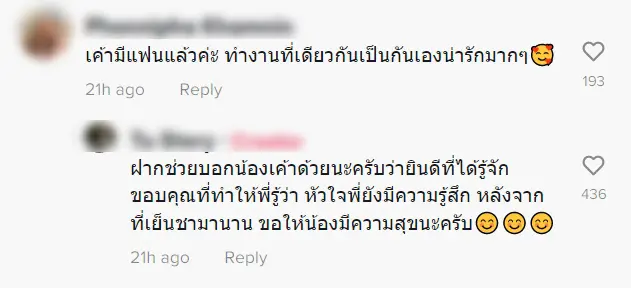 งานนี้ทำเอาชาวเน็ตแห่คอมเม้นท์ถึงเรื่องที่สุดน่ารักดังกล่าวพร้อมเชียร์และเป็นกำลังใจให้ทั้งคู่ได้พบเจอกันอีก โดยมีคอมเม้นท์หนึ่งได้เข้ามาโพสต์อธิบายเพิ่มเติมว่า “เค้ามีแฟนแล้วค่ะ ทำงานที่เดียวกันเป็นกันเองน่ารักมากๆ” ซึ่งทางหนุ่มเจ้าของโพสต์ก็ได้ตอบกลับว่า “ฝากช่วยบอกน้องเค้าด้วยนะครับว่ายินดีที่ได้รู้จัก ขอบคุณที่ทำให้พี่รู้ว่า หัวใจพี่ยังมีความรู้สึก หลังจากที่เย็นชามานาน ขอให้น้องมีความสุขนะครับ” งานนี้ถือว่าเป็นเรื่องราวดีๆที่เกิดขึ้นโดยไม่ได้หวังผลที่จะต้องจบสวยหรูแบบในละครก็ว่าได้