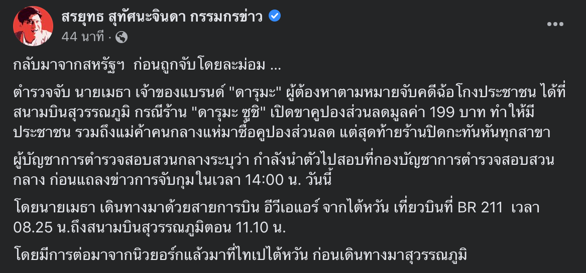 ตำรวจจับ นายเมธา เจ้าของแบรนด์ “ดารุมะ” ผู้ต้องหาตามหมายจับคดีฉ้อโกงประชาชน