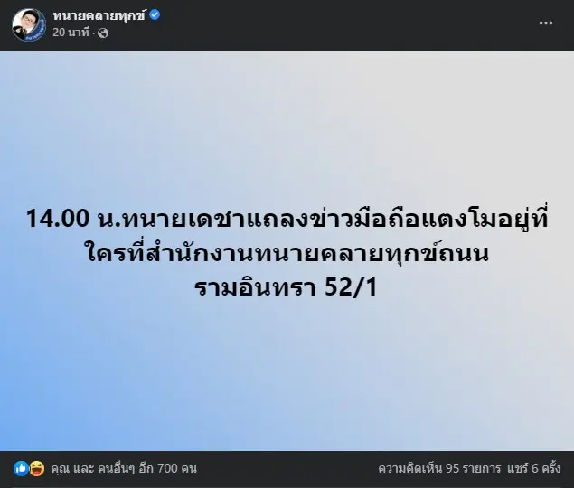 ล่าสุด ทนายเดชา ได้อัพเดทข้อมูลลงในเพจเฟซบุ๊ก ทนายคลายทุกข์ ระบุว่า