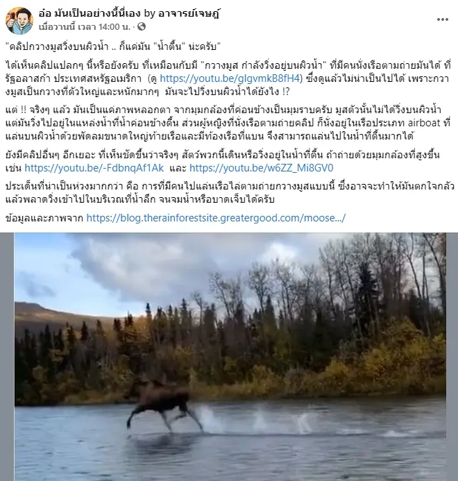 โดยระบุว่า “ได้เห็นคลิปแปลกๆ นี้หรือยังครับ ที่เหมือนกับมี “กวางมูส กำลังวิ่งอยู่บนผิวน้ำ” ที่มีคนนั่งเรือตามถ่ายมันได้ ที่รัฐอลาสก้า ประเทศสหรัฐอเมริกา ซึ่งดูแล้วไม่น่าเป็นไปได้ เพราะกวางมูสเป็นกวางที่ตัวใหญ่และหนักมากๆ มันจะไปวิ่งบนผิวน้ำได้ยังไง !?