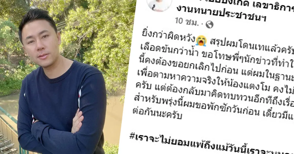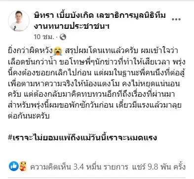 ยิ่งกว่าผิดหวัง สรุปผมโดนเทแล้วครับ ผมเข้าใจว่าเลือดข้นกว่าน้ำ ขอโทษพี่ๆนักข่าวที่ทำให้เสียเวลา พรุ่งนี้คงต้องขอยกเลิกไปก่อน แต่ผมในฐานะพี่คนนึงที่ต่อสู้เพื่อตามหาความจริงให้น้องแตงโม คงไม่หยุดแน่นอนครับ แต่ต้องกลับมาคิดทบทวนอีกทีถึงเรื่องที่ผ่านมา สำหรับพรุ่งนี้ผมขอพักซักวันก่อน เดี๋ยวมีแรงแล้วมาลุยต่อกันนะครับ