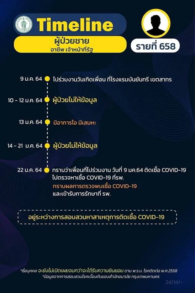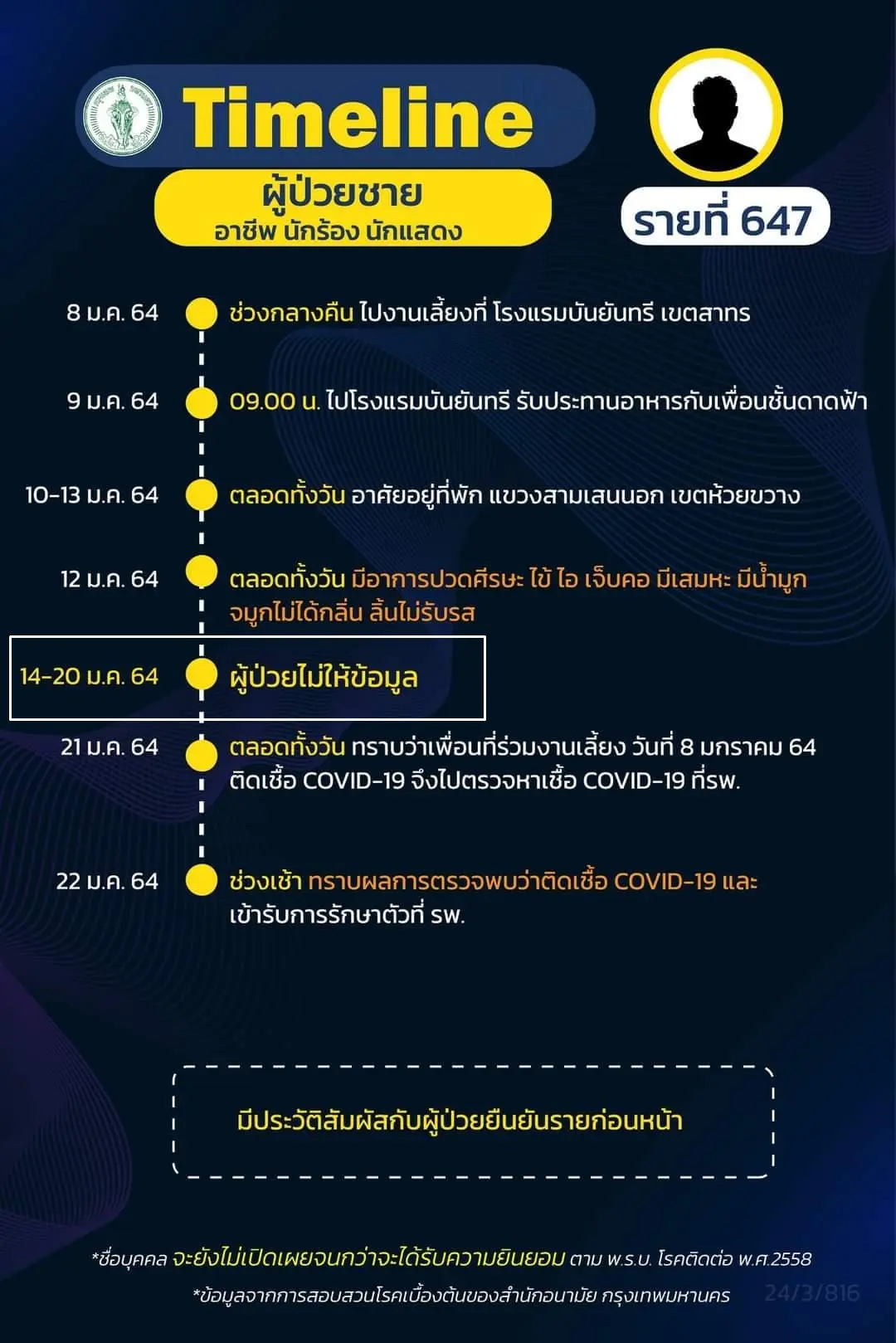 โดยในไทม์ไลน์ผู้ป่วยโควิดกรุงเทพ รายที่ 647 รายงานว่า ผู้ป่วยชาย อาชีพนักร้อง นักแสดง พบว่าช่วงวันที่ 14-20 มกราคม 2564 ผู้ป่วยไม่ได้มีการให้ข้อมูล ทั้งที่หลายวันก่อนหน้านั้น เดินทางไปทำกิจกรรมหลายแห่ง