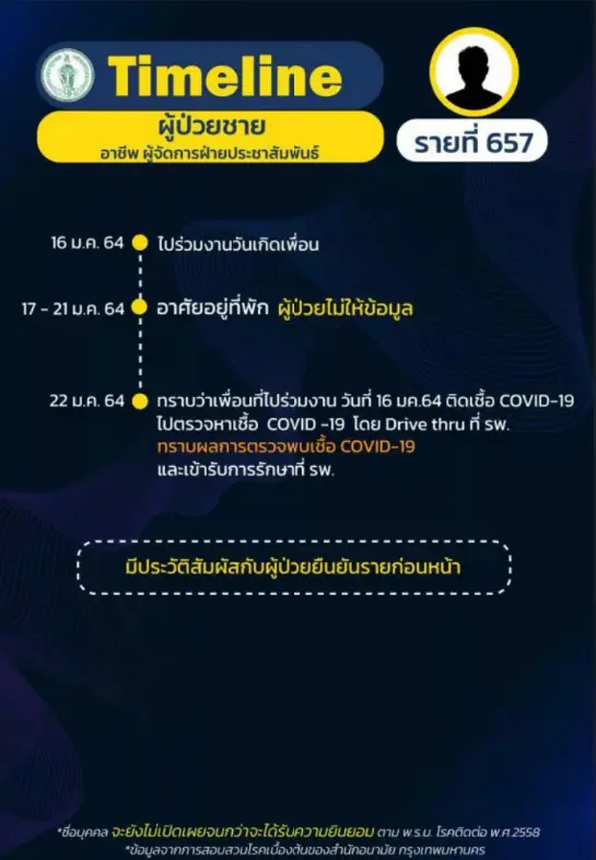 ขณะที่รายที่ 657 ผู้ป่วยชาย อาชีพผู้จัดการฝ่ายประชาสัมพันธ์ มีรายงานว่า ผู้ป่วยไม่ให้ข้อมูลเช่นกัน โดยก่อนหน้านี้ ไปร่วมงานวันเกิดเพื่อน