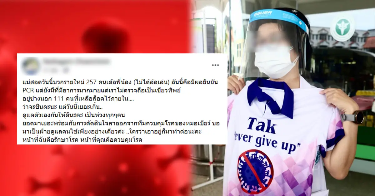 ล่าสุดผู้ใช้เฟซบุ๊กรายหนึ่งซึ่งเป็นบุคลากรคนสำคัญที่อยู่ด่านหน้า และปฎิบัตงานอยู่ในโรงพยาบาลแม่สอด นั้นก็คือ แพทย์หญิงณัฐกานต์ ชื่นชม อายุรแพทย์โรคติดเชื้อโรงพยาบาลแม่สอด หัวหน้าทีมควบคุมโรคบริหารจัดการทีมโควิดโรงพยาบาลแม่สอด โพสต์ข้อความลงเฟซบุ๊กส่วนตัว ระบายความรู้สึกสุดช็อกเมื่อเห็นตัวเลขผู้ติดเชื้อที่แม่สอด คืนเดียว 257 ราย และอีกมายมายที่ยังรอผล พร้อมทั้งยังบอกอีกว่ายอดมาพร้อมกับวันที่จะลาออกจากทีมควบคุมโรค โดยระบุว่า