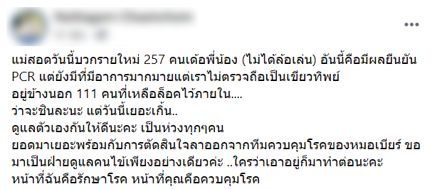 “แม่สอดวันนี้บวกรายใหม่ 257 คนเด้อพี่น้อง (ไม่ได้ล้อเล่น) อันนี้คือมีผลยืนยัน PCR แต่ยังมีที่มีอาการมากมายแต่เราไม่ตรวจถือเป็นเขียวทิพย์ อยู่ข้างนอก 111 คนที่เหลือล็อคไว้ภายใน….ว่าจะชินละนะ แต่วันนี้เยอะเกิ้น..ดูแลตัวเองกันให้ดีนะคะ