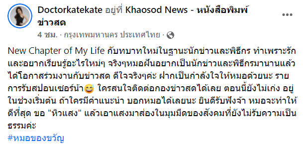 โดยล่าสุด เมื่อวันที่ 27 เมษายน 2565 ด้านของคุณหมอของขวัญโพสต์ข้อความผ่านทางเพจเฟซบุ๊กDoctorkatekate ระบุว่า New Chapter of My Life กับทบาทใหม่ในฐานะนักข่าวและพิธีกร ทำเพราะรักและอยากเรียนรู้อะไรใหม่ๆ จริงๆหมอฝันอยากเป็นนักข่าวและพิธีกรมานานแล้ว ได้โอกาสร่วมงานกับข่าวสด ดีใจจริงๆค่ะ