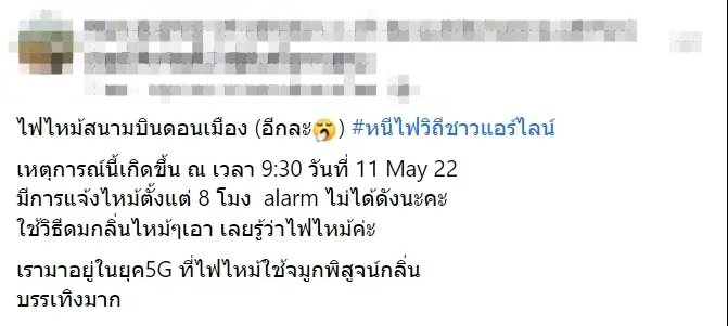 ดูแล้วจะกลายเป็นเรื่องชิวของพนักงานสนามบินเมื่อ ไฟไหม้สนามบินดอนเมือง รอบ 2 ไม่รู้สาเหตุมาจากอะไรแต่ที่แน่ๆสัญญาณเตือนภัยไม่ดังแต่รู้ได้เพราะได้กลิ่น