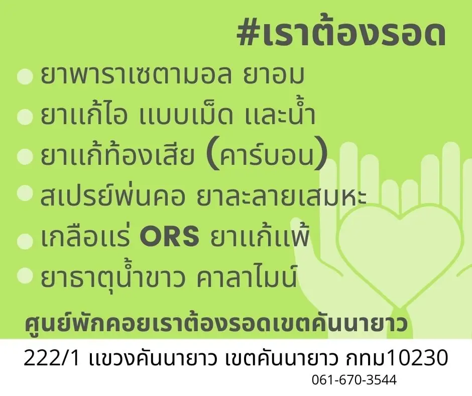 ศูนย์พักคอยเราต้องรอดเขตคันนายาว หรือสามารถส่งพัสดุไปได้ที่ ศูนย์พักคอย เราต้องรอด 222/1 แขวงคันนายาว เขตคันนายาว กรุงเทพมหานคร 10230 (ตรงข้ามสวนสยาม) เบอร์ติดต่อ 0616703544