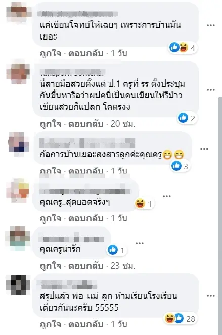 หลังจากที่โพสต์ดังกล่าวถูกเผยแพร่ออกไปต่างก็มีชาวเน็ตหลายรายได้แชร์ต่อพร้อมกับร่วมแสดงความคิดเห็นระบุว่า แค่เขียนโจทย์ให้เฉยๆ เพราะการบ้านมันเยอะ , นี่ลายมือสวยตั้งแต่ ป.1 ครูที่ รร ตั้งประชุมกันขึ้นหารือว่าผปคนี่เป็นคนเขียนให้รึป่าว เขียนสวยก็แปลก โคตรงง , สรุปแล้ว พ่อ-เเม่-ลูก ห้ามเรียนโรงเรียนเดียวกันนะครับ