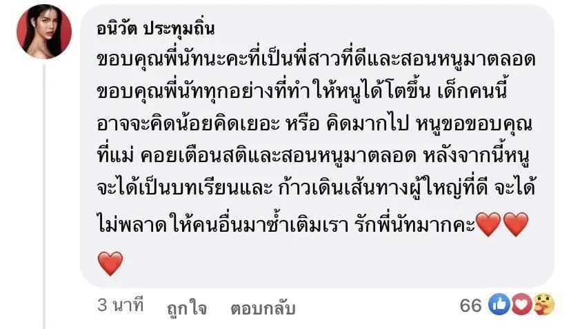 - ในวันเดียวกันนั้น นารา ได้มีการไปคอมเมนต์ใต้โพสต์ดังกล่าวของ นัท นิสามณี ด้วยข้อความว่า ขอบคุณพี่นัทนะคะที่เป็นพี่สาวที่ดีและสอนหนูมาตลอด ขอบคุณพี่นัททุกอย่างที่ทำให้หนูได้โตขึ้น เด็กคนนี้อาจจะคิดน้อยคิดเยอะ หรือ คิดมากไป หนูขอขอบคุณที่แม่คอยเตือนสติและสอนหนูมาตลอด หลังจากนี้หนูจะได้เป็นบทเรียนและ ก้าวเดินเส้นทางผู้ใหญ่ที่ดี จะได้ไม่พลาดให้คนอื่นมาซ้ำเติมเรา รักพี่นัทมากค่ะ เป็นอันจบลงด้วยดี