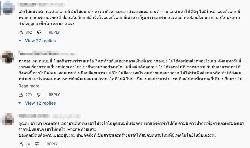 จากคลิป “แต่งตัวเป็นชาวนาไปซื้อไอโฟน 13 Pro Max !” ที่ต้องการจะทดสอบสังคมนี้เองทำให้กลายเป็นกระแสวิพากษ์วิจารณ์ขึ้นมามากมาย ซึ่งบางรายก็ได้ระบุว่าชาวนาไม่ได้แต่งตัวแบบนี้ไปในทุกสถานที่มีเสื้อผ้าเสื้อที่ใส่เเล้วถูกกาละเทศะ พร้อมกับบอกให้เลิกทำคอนเทนต์ในลักษณะนี้ เนื่องจากเหมือนเป็นการให้เกียรติอาชีพและเป็ฯการเหยียดไปในตัวอีกด้วย
