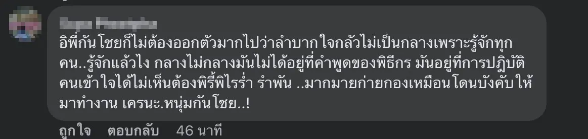 - อิพี่กันโชยก็ไม่ต้องออกตัวมากไปว่าลำบากใจกลัวไม่เป็นกลางเพราะรู้จักทุกคน..รู้จักแล้วไง กลางไม่กลางมันไม่ได้อยู่ที่คำพูดของพิธีกร มันอยู่ที่การปฎิบัติ คนเข้าใจได้ไม่เห็นต้องพิรี้พิไรร่ำ รำพัน ..มากมายก่ายกองเหมือนโดนบังคับให้มาทำงาน เครนะ.หนุ่มกันโชย..!