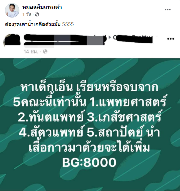 วงการนี้การแข่งขันสูงมาก ครั้งนี้คัดสรรเกรดA+ โดยเฉพาะ โซเชียลแชร์ หาเด็กเอ็น ดีกรีหมอ/ทันตะ/เภสัช/สัตวแพทย์ และ สถาปัตย์ และหากมีเสื้อกาวน์บวกค่าตัวเพิ่ม
