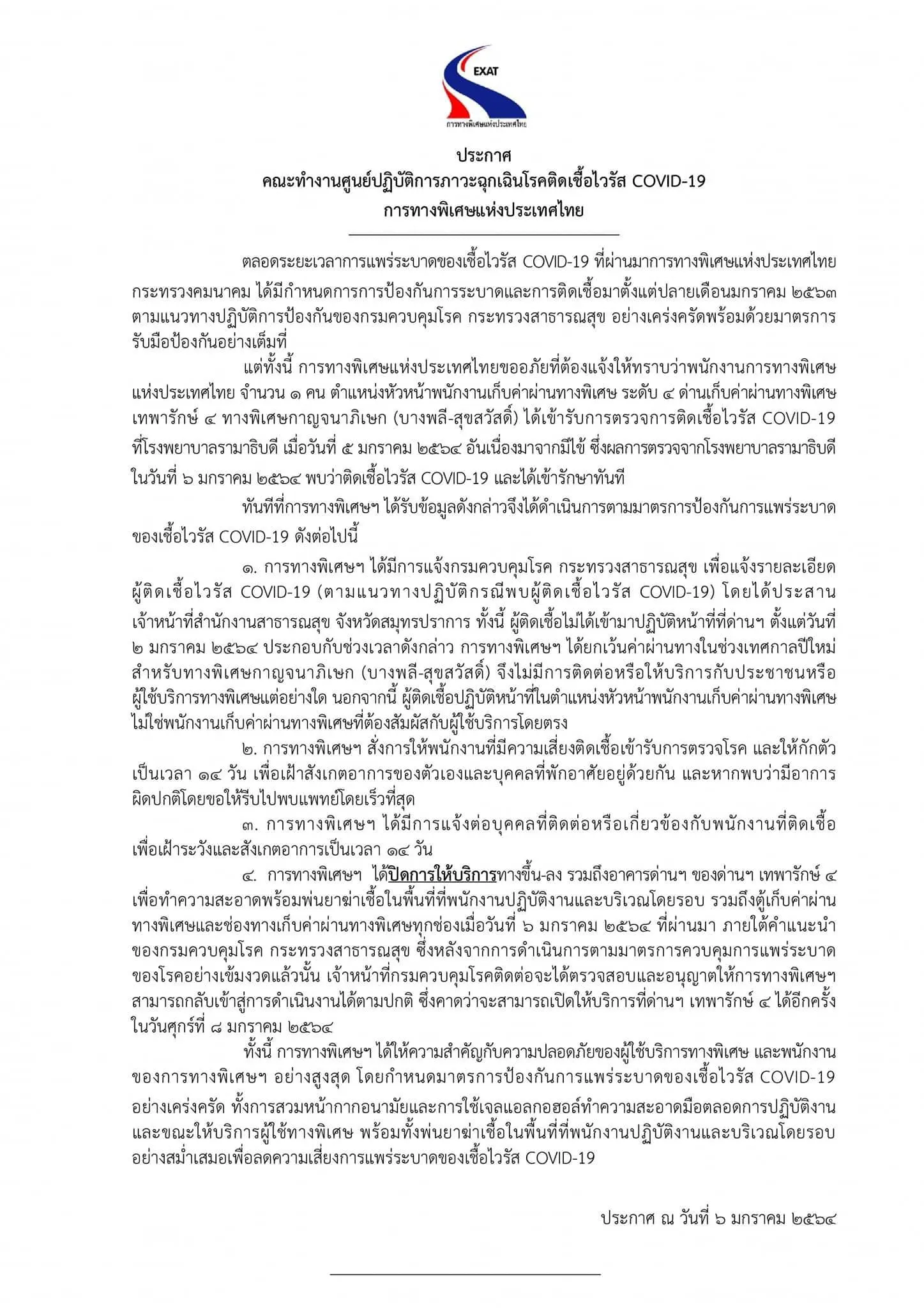 เนื่องจากการทางพิเศษแห่งประเทศไทย (กทพ.) พบว่าหัวหน้าพนักงานเก็บเงินค่าผ่านทางพิเศษด่านฯ เทพารักษ์ 4 ทางพิเศษกาญจนาภิเษก (บางพลี-สุขสวัสดิ์)ได้ติดเชื้อ COVID-19 และจากการตรวจสอบพบว่า พนักงานคนดังกล่าว “มิได้” ลงตู้ และ “มิได้” สัมผัสติดต่อกับลูกค้าผู้ใช้ทางพิเศษแต่อย่างใด (รายละเอียดตามประกาศ)