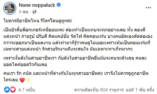 ทั้งนี้เธอยังได้ออกมาโพสต์อีกว่า “ไม่ควรมีอาชีพไหน รึใครโดนดูถูกค่ะ เป็นบิวตี้บล็อกเกอร์เหนื่อยนะคะ ต้องทำเป็นแทบจะทุกอย่างเลย ทั้ง ลองสี แต่งหน้า ถ่ายรูป ปรับสี คิดแคปชั่น จัดไฟ คิดคอนเท้น บางคนอัดเองตัดต่อเอง กว่าจะออกมาเป็นผลงาน
