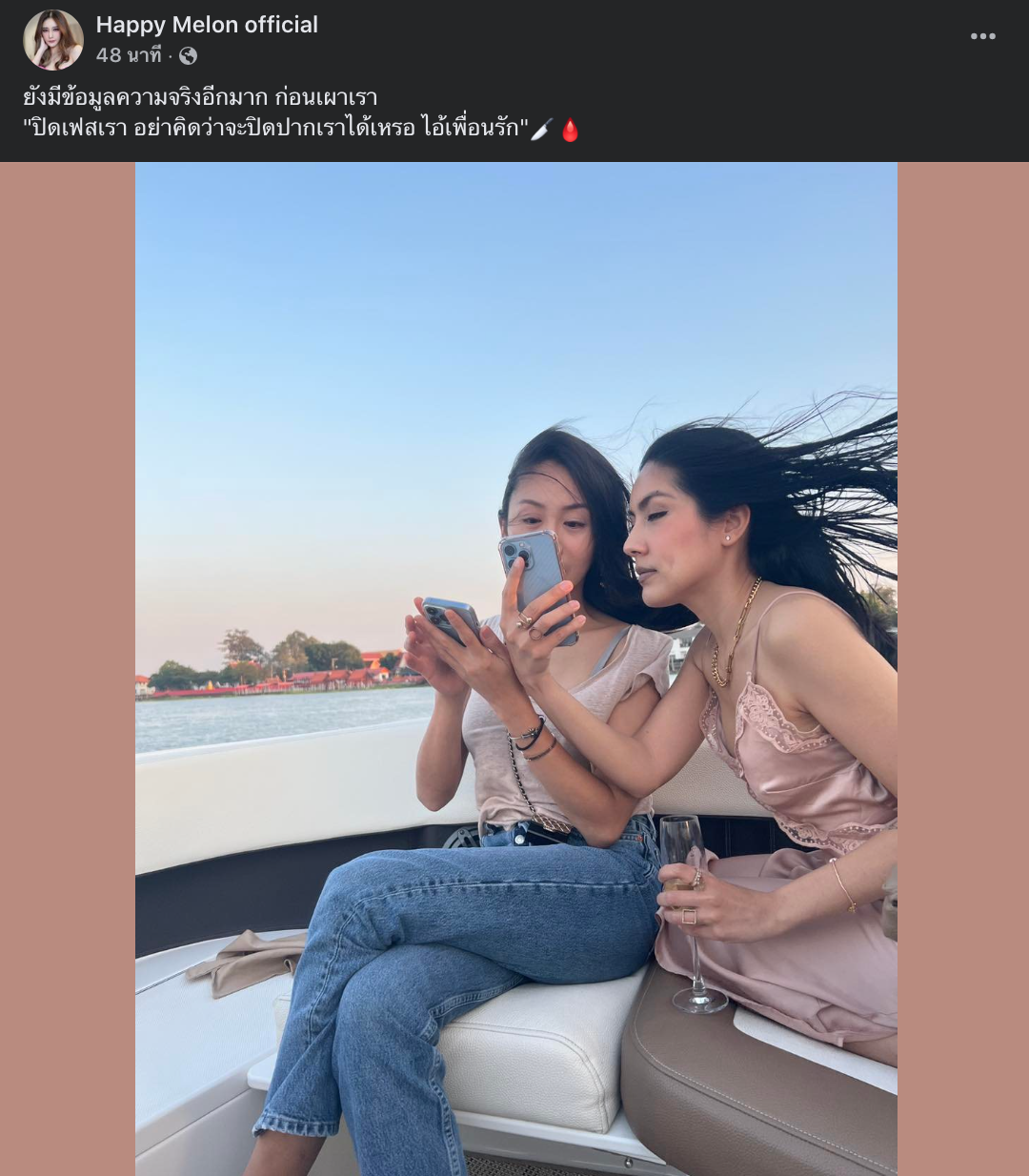 ล่าสุดเวลาประมาณ 07:30 เฟซบุ๊ก Happy Melon official ก็ได้ปล่อยรูปภาพอีกครั้ง พร้อมแคปชั่นว่า “ยังมีข้อมูลความจริงอีกมาก ก่อนเผาเรา ปิดเฟสเรา อย่าคิดว่าจะปิดปากเราได้เหรอ ไอ้เพื่อนรัก”