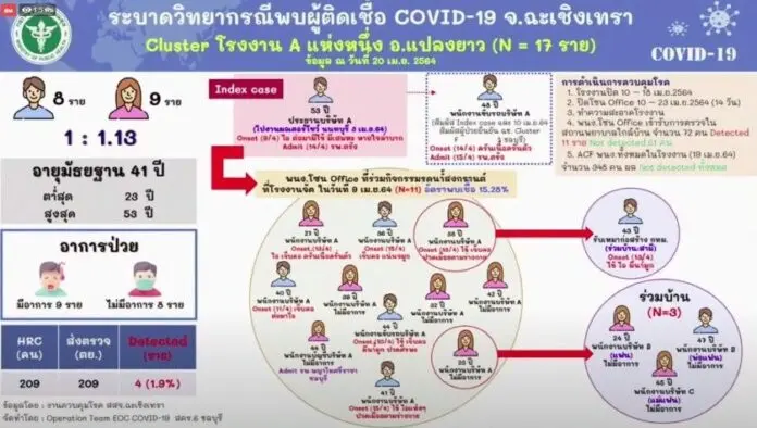 เจออีกแล้ว คลัสเตอร์โรงงาน ฉะเชิงเทรา เริ่มจากประธานบริษัทติดเชื้อโควิด-19 และจัดงานรดน้ำดำหัวช่วงสงกรานต์ แพร่ติดอีก 17 คน โยง งานมอเตอร์โชว์ เมื่อต้นเดือน