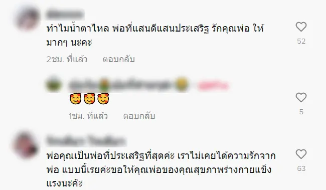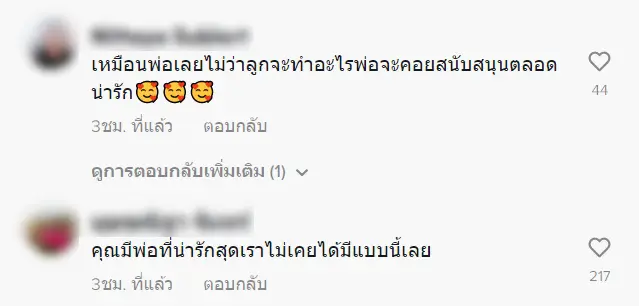 ทั้งนี้ อย่างที่กล่าวไปข้างต้นว่าความเป็นพ่อเป็นแม่นั้นยอมทำทุกอย่างได้เพื่อลูก ซึ่งจากเหตุการณ์นี้ทำเอาชาวเน็ตต่างเข้ามาคอมเม้นท์ถึงเหตุการณ์สุดซึ้งนี้ว่า นี่แหละผู้ชายที่รักเราที่สุดในโลก และพร้อมทำให้เราโดยไม่ต้องร้องขอ ต่อให้เราจะเติบโตไปสักเท่าไร แต่ลูกก็คือลูกอยู่วันยังค่ำ