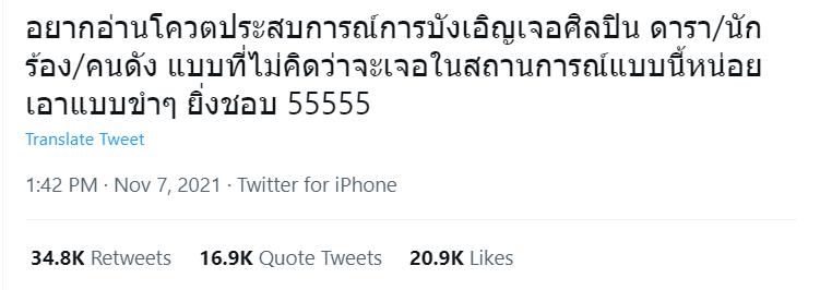 สืบเนื่องจากผู้ใช้ทวิตเตอร์รายหนึ่ง ทวิตหัวข้อ ให้ชาวเน็ตเข้ามาแชร์ “ประสบการณ์บังเอิญเจอศิลปิน ดารา/นักร้อง/คนดัง แบบที่ไม่คิดว่าจะเจอในสถานการณ์แบบนี้หน่อย เอาแบบขำๆ ยิ่งชอบ 55555” ซึ่งใต้โพสต์ดังกล่าวมีคนเข้ามาเล่าประสบการณ์ของตัวเองมากมาย