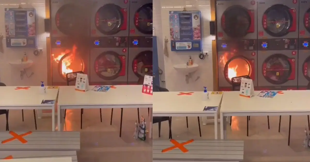 แชร์อุทาหรณ์! หวั่นกลายเป็นเหตุเพลิงไหม้ กรณีไฟลุกท่วม เครื่องอบผ้าขณะทำงาน ในร้านบริการซักแห้ง คาดผู้เจ้าของผ้าลืมไฟแช็กไว้ในกางเกง
