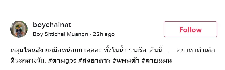 โดยหนุ่มผู้โพสต์ระบุข้อความว่า “หลุมไหนสั่ง ยกมือหน่อย ทั้งในน้ำ บนเรืออันนี้…. อย่าหาทำเด้อ ดีนะกลางวัน #ตามgps #ส่งอาหาร”