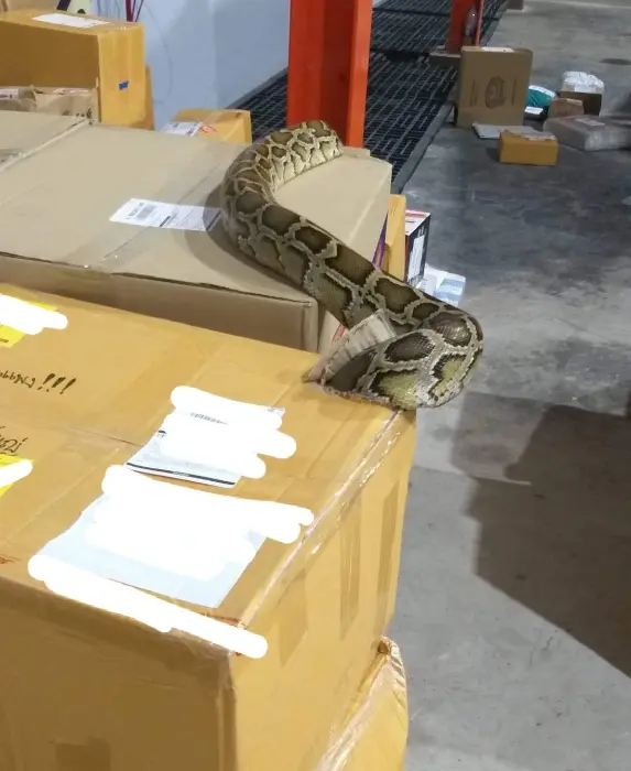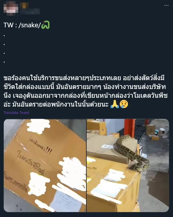 เมื่อวันที่ 16 มีนาคม ผู้ใช้ทวิตเตอร์รายหนึ่งได้ทวิตรูปภาพพร้อมข้อความ ที่ทำเอาชาวเน็ตต่างขนหัวลุกไปตามๆ กัน เพราะภาพดังกล่าวนั้นเป็นภาพจากที่พนักงานบริษัทขนส่งรายหนึ่ง พบกับสิ่งมีชีวิตตัวยาวใหญ่โผล่ออกมาจากกล่องพัสดุ โดยเจ้าของทวิตได้ระบุข้อความว่า “ขอร้องคนใช้บริการขนส่งหลายๆประเภทเลย อย่าส่งสัตว์สิ่งมีชีวิตใส่กล่องแบบนี้ มันอันตรายมากๆ น้องทำงานขนส่งบริษัทนึง เจองูดันออกมาจากกล่องที่เขียนหน้ากล่องว่าโมเดลวันพีชอ่ะ มันอันตรายต่อพนักงานในนั้นด้วยนะ”