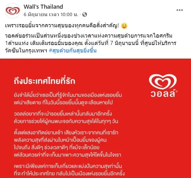 - ไอศกรีมวอลล์ คืนรอยยิ้ม แจกไอศกรีมฟรี 1 ล้านแท่ง