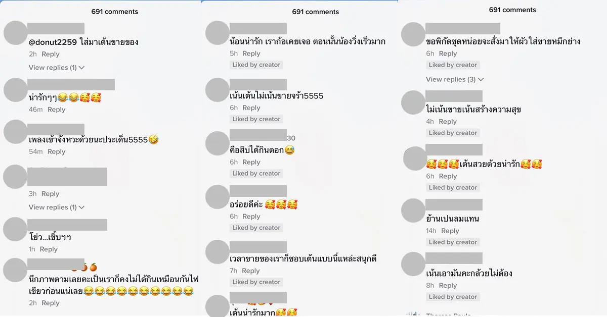 ทั้งนี้คลิปทั้งกล่าวถูกแชร์แแกไปกว่าแปดร้อยกว่าครั้ง ชาวเน็ตที่เห็นคลิปกังกล่าวต่างเข้ามาคอมเมนต์ เรียกรอยยิ้มไม่มากก็น้อย โดยส่วนใหญ่ต่างพูดเป็นทำนองเดียวกันว่า เน้นเต้น ไม่เน้นขาย แถมยังมีแซวอีกว่า “วนรถกลับมาซื้อใหม่ พี่เขาคงเต้นเสร็จพอดี” เป็นสีสันในวันที่อากาศร้อน