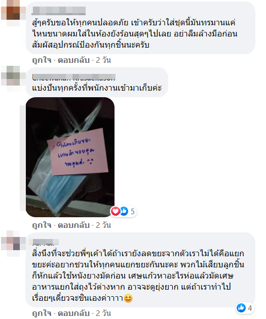 จนคนแห่เข้ามาคอมเมนต์ให้กำลังพี่ ๆ พนักงานเก็บขยะกันอย่างล้นหลาม ที่ต้องเสี่ยงเข้าไปในพื้นที่ต่าง ๆ เพื่อเก็บขยะ ติดเชื้อเช่นแมสก์ หรือหน้ากากอยามัยต่าง ๆ ที่เราใช้แล้วทิ้งแบบไม่ได้คัดแยก หรือขยะเน่าเหม็นต่าง ๆ ที่เรามักจะรังเกียจกัน