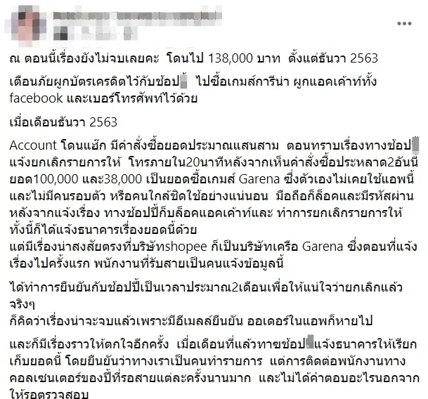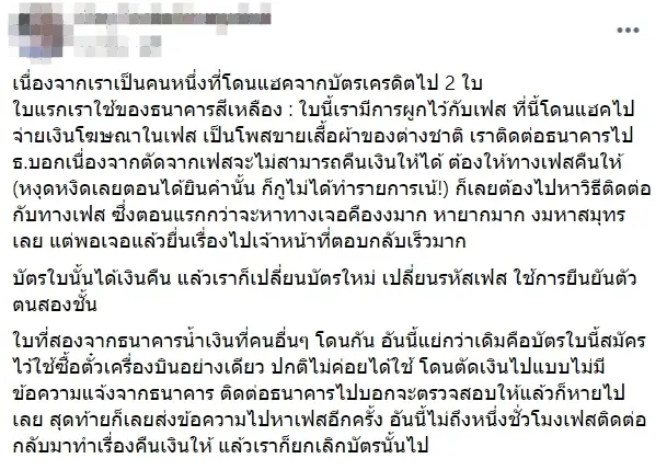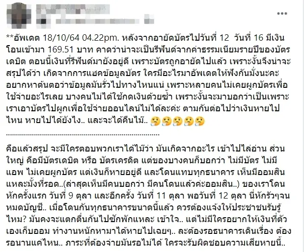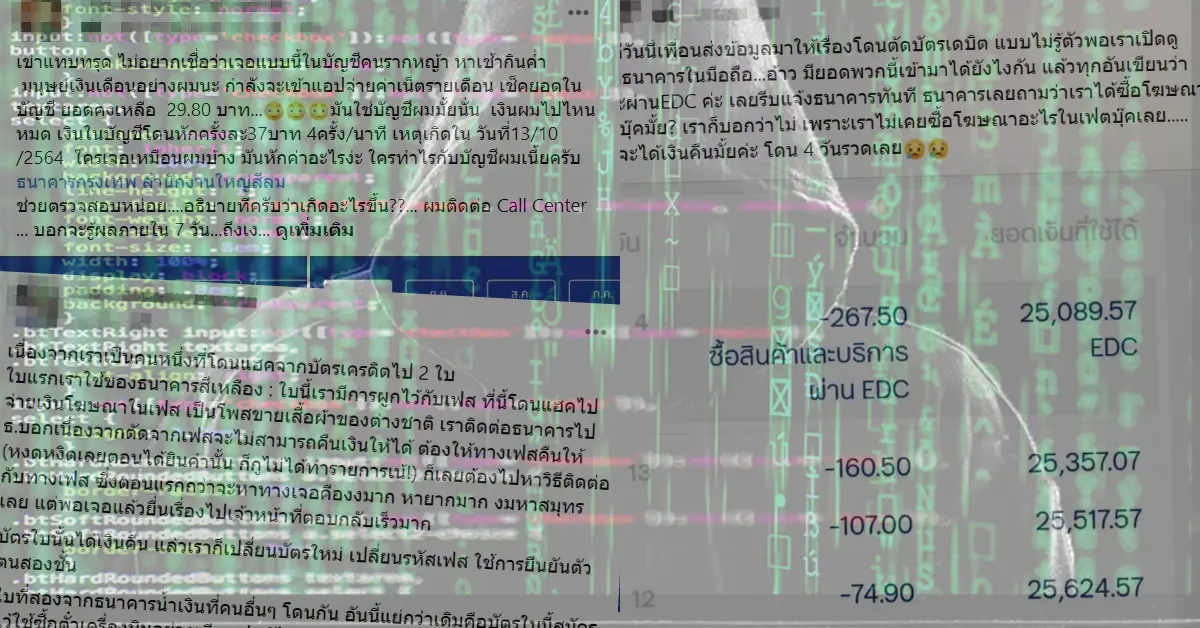 ล่าสุดกลุ่มเฟซบุ๊ก แชร์ประสบการณ์โดนหักเงินจากบัญชีโดยไม่รู้ตัว ได้มีผู้เสียหายเข้ามาแชร์ประสบการณ์โดนดูดเงินจากบัญชีธนาคารอย่างต่อเนื่อง นอกจากนี้ยังมีชาวเน็ตเข้ามาแชร์ประสบการณ์เมื่อปี 2563 เมื่อแฮคเกอร์ดูดเงินจากแอปฯช้อปปิ้งชื่อดัง