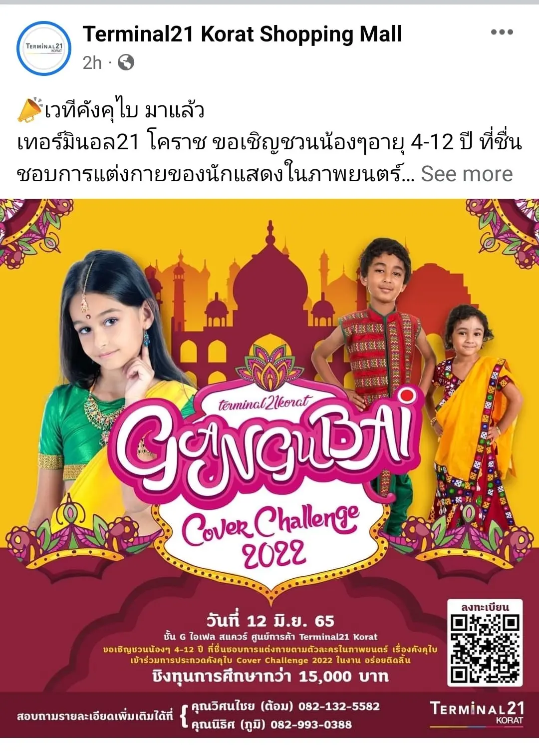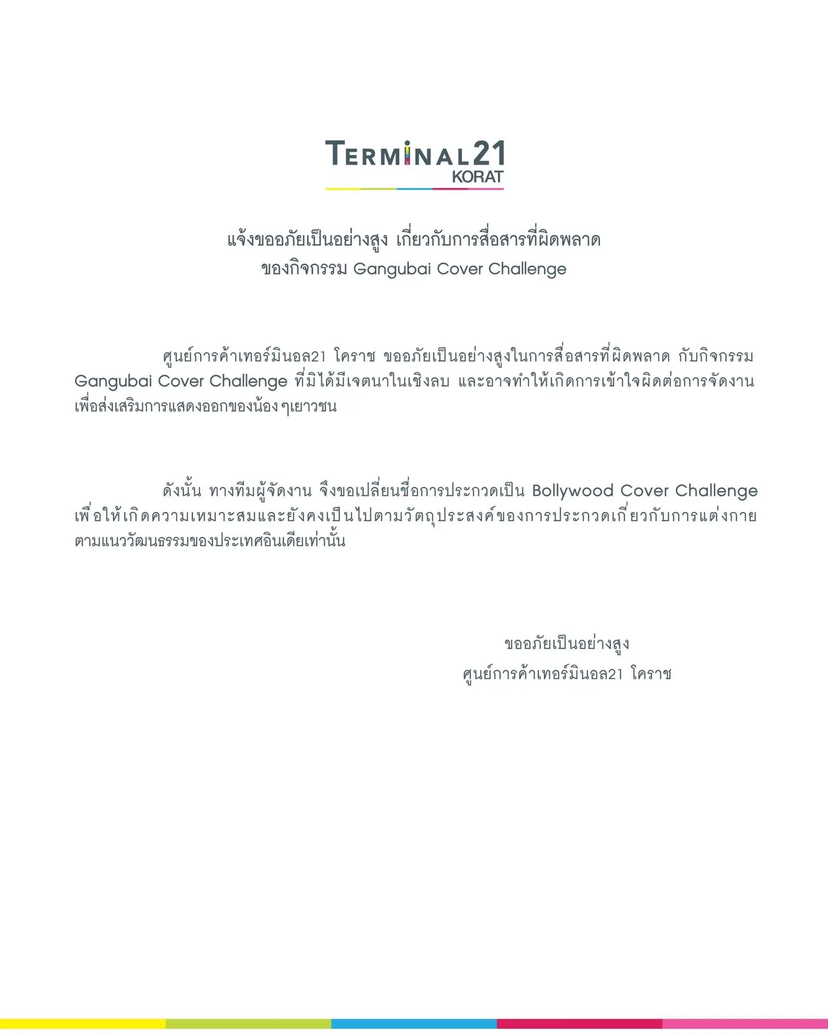 “ศูนย์การค้าเทอร์มินอล21 โคราช ขออภัยเป็นอย่างสูงในการสื่อสารที่ผิดพลาด กับกิจกรรม Gangubai Cover Challenge ที่มิได้มีเจตนาในเชิงลบ และอาจทำให้เกิดการเข้าใจผิดต่อการจัดงานเพื่อส่งเสริมการแสดงออกของน้องๆเยาวชน
