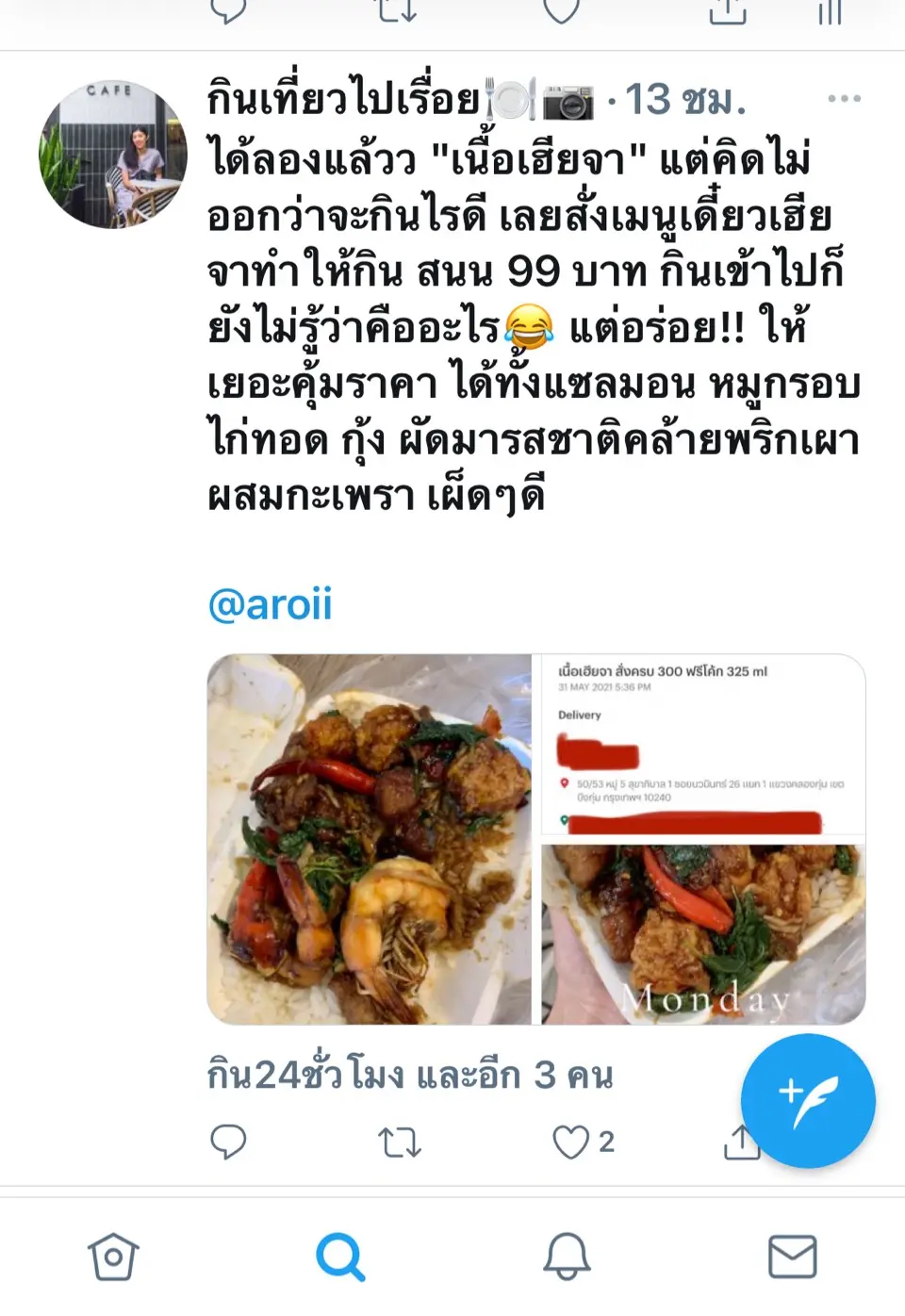 นอกจากนี้ เฮียจา ระบุด้วยว่า ร้านอาหารเดริเวรีที่นักชิมห้ามพลาด มีเมนูเนื้อเด็ดๆอาหารดีดี อิ่มอร่อย คุ้มค่าคุ้มราคามากมาย ตามสโลแกน อาหารดี ราคาประหยัด รสโหดสัส จัดเต็มสูตรเฮียจา เราจะอิ่มไปด้วยกัน!!! ยังมีเมนูฮิตติดเทรนด์อีกมากมายโดยเฉพาะสายเนื้อห้ามพลาด อาทิ เดี๋ยวเฮียจาทำให้กิน รวมมิตรแซวดาวการเมือง ข้าวผัดเกลือชมพูหน้าเนื้อโคขุน สเต๊คเนื้อสันนอกย่างชิ้นใหญ่หอมจัดหนักหมักเครื่องเทศ เนื้อโคขุนย่างเนยข้าวคั่วแจ่ว ต้มซุปเนื้อตุ๋น กระเพราเนื้อตุ๋น แกงมัสมั่นเนื้อ เนื้อย่างสลัดซีอิ๊วญี่ปุ่น เบอร์เกอร์เนื้อโคขุนสลัดซีอิ๊วญี่ปุ่น เนื้อทอดโคขุนสูตรโคคิงส์ รวมถึงเมนูฮิตติดเทรนด์ทวิตเตอร์ยอดรีทวิตเกือบ 3 หมื่นครั้ง อย่างเมนู เดี๋ยวเฮียทำให้กิน ซึ่งลูกค้าแค่ไกด์มาว่ากินอะไรไม่ได้บ้าง ที่เหลือรอรับอาหารสูตรเด็ดจัดเต็มจากเฮียจาที่บ้าน