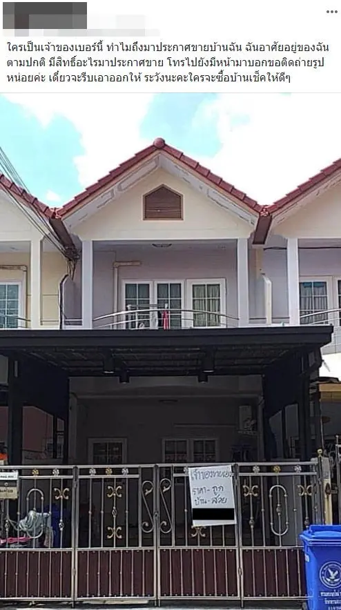 โดยผู้ใช้เฟซบุ๊กดังกล่าวระบุว่า “ใครเป็นเจ้าของเบอร์นี้ ทำไมถึงมาประกาศขายบ้านฉัน ฉันอาศัยอยู่ของฉันตามปกติ มีสิทธิ์อะไรมาประกาศขาย โทรไปยังมีหน้ามาบอกขอติดถ่ายรูปหน่อยค่ะ เดี๋ยวจะรีบเอาออกให้ ระวังนะคะใครจะซื้อบ้านเช็คให้ดีๆ”