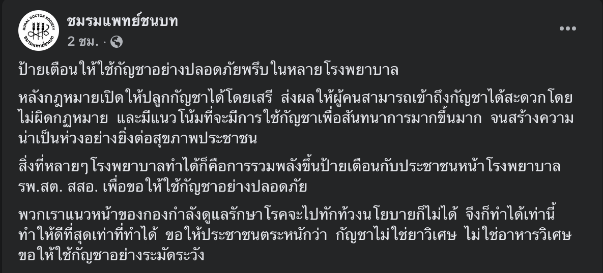 ล่าสุดทางเพจ ชมรมแพทย์ชนบท ก็ได้ออกมาโพสต์เกี่ยวกับความเป็นห่วงเป็นใยของโรงพยาบาลหลายแห่ง ที่กังวลในเรื่องของการใช้ กัญชา แบบเกินขนาดหรือไม่ถูกต้อง โดยแต่ละโรงพยาบาลจะทำการขึ้นป้ายเพื่อนบอกวิธีใช้และปริมาณที่รับได้ของร่างกายแต่ละคน โดยระบุข้อความว่า